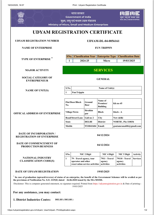 FunTripping is also registered under the Udyam Registration (MSME) by the Government of India. This certification recognizes us as a legitimate and growing enterprise contributing to the economy while maintaining quality standards.